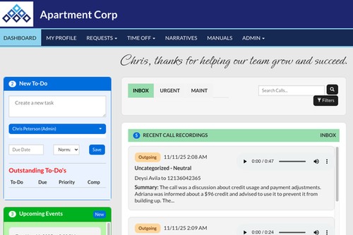 My Apartment Corp is the internal Human Resources intranet site used by the team at Apartment Corp to manage their vacation time, sick time, and overtime requests, to name a few.